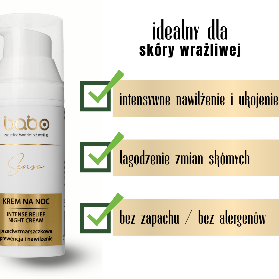 Krem SENSO wspiera odbudowę bariery hydrolipidowej, intensywnie nawilża dzięki wparciu NMF i olejom roślinnym oraz zmniejsza widoczność zmarszczek. Intensywnie wspiera regenerację i ujędrnia, dzięki czemu zmarszczki stają się mniej widoczne, a skóra odzyskuje komfort, elastyczność i zdrowy wygląd. Bezzapachowy, odpowiedni dla skóry wrażliwej i suchej. Idealnie sprawdzi się zimą, jako krem okluzyjny i bariera przed mrozem oraz zimowym przesuszeniem, jako odżywczy krem na noc – przywracając nawilżenie, a także jako krem barierowy dla alergików – alergeny będą miały utrudnioną migrację do naskórka.
