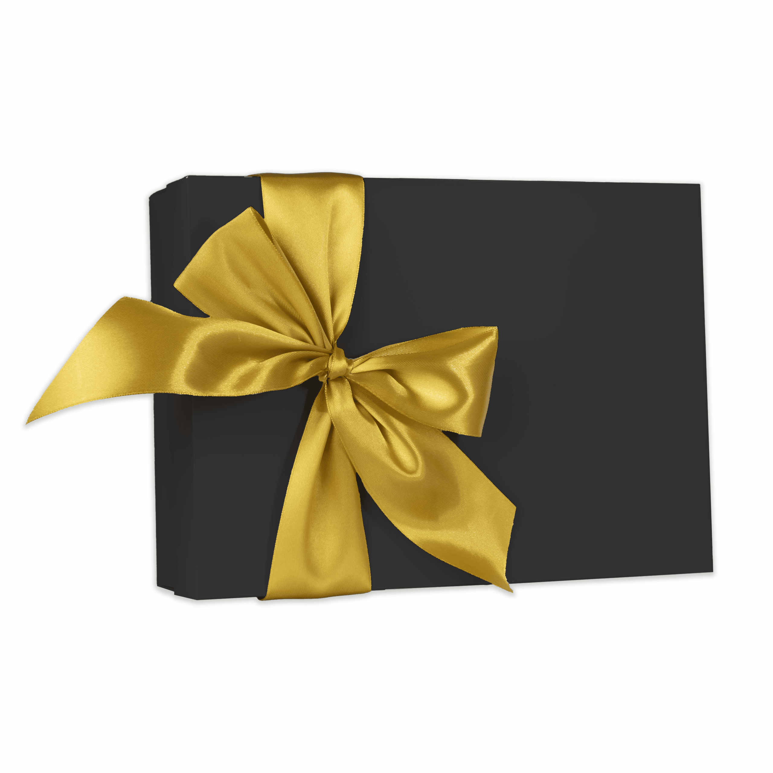Czarne opakowanie prezentowe, składane ręcznie z najwyższą starannością. Pudełko wykonane z mocnego papieru, lakierowane. Pudełko zamykane wieczkiem o tym samym kolorze. Całość przewiązana złotą kokardą o szerokości 5cm.