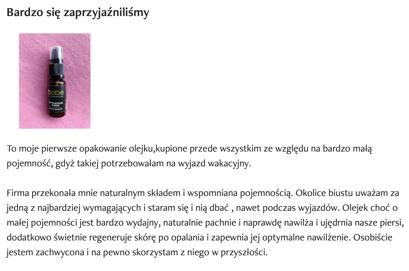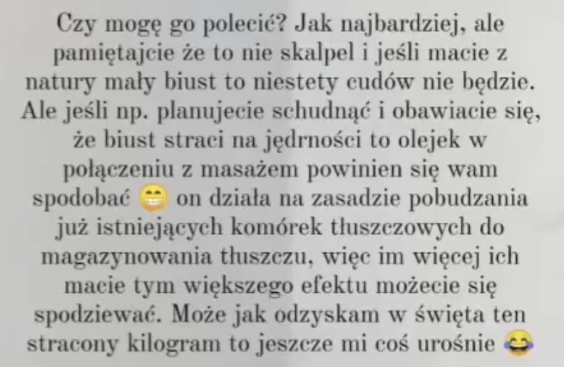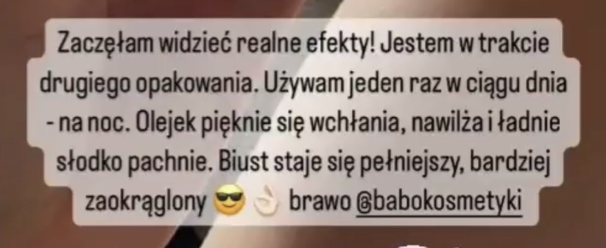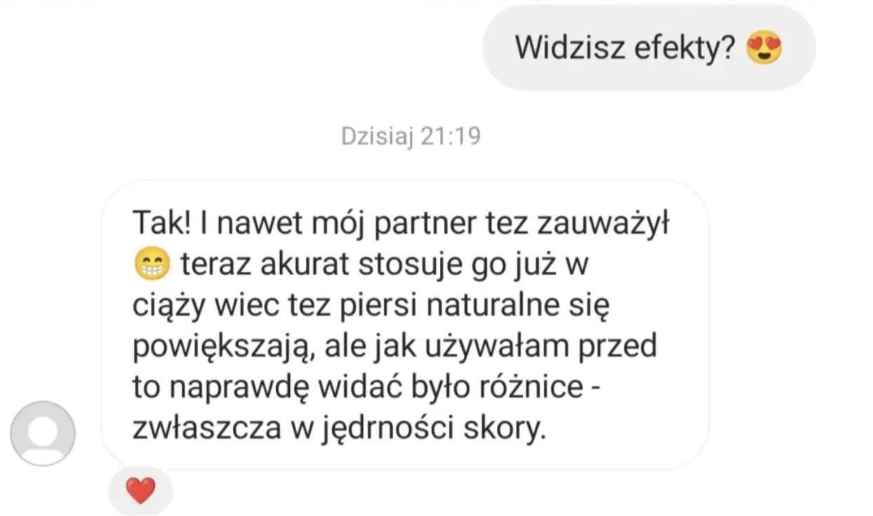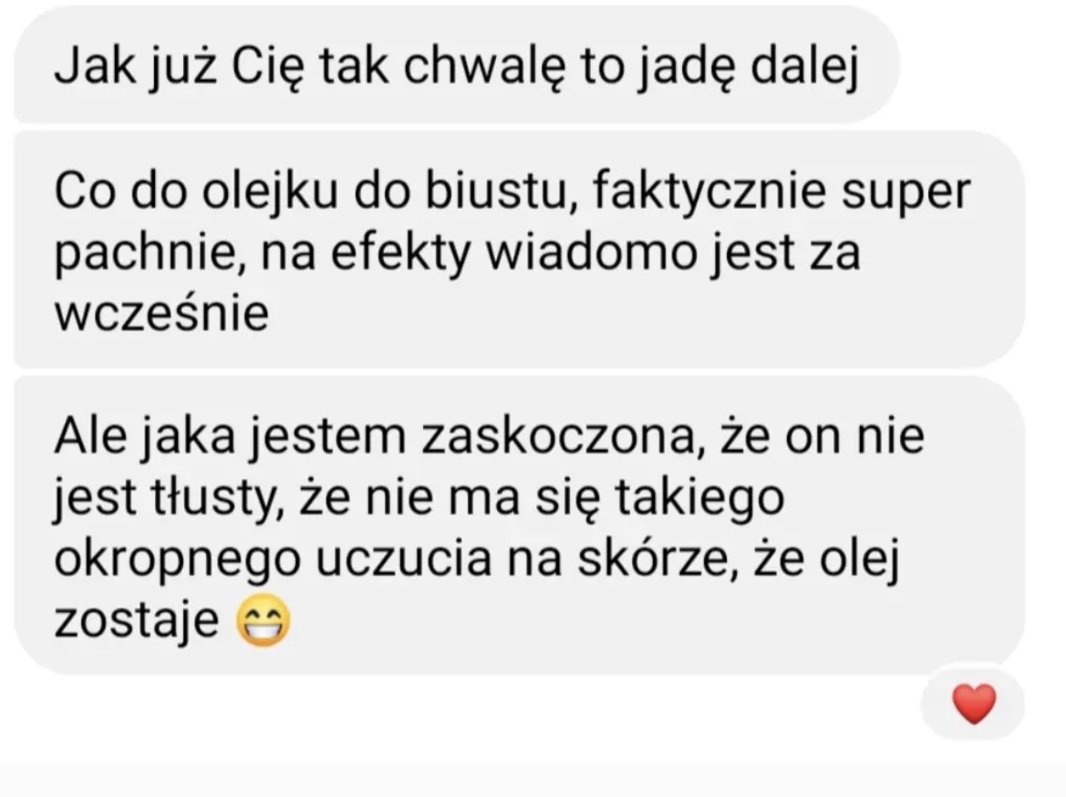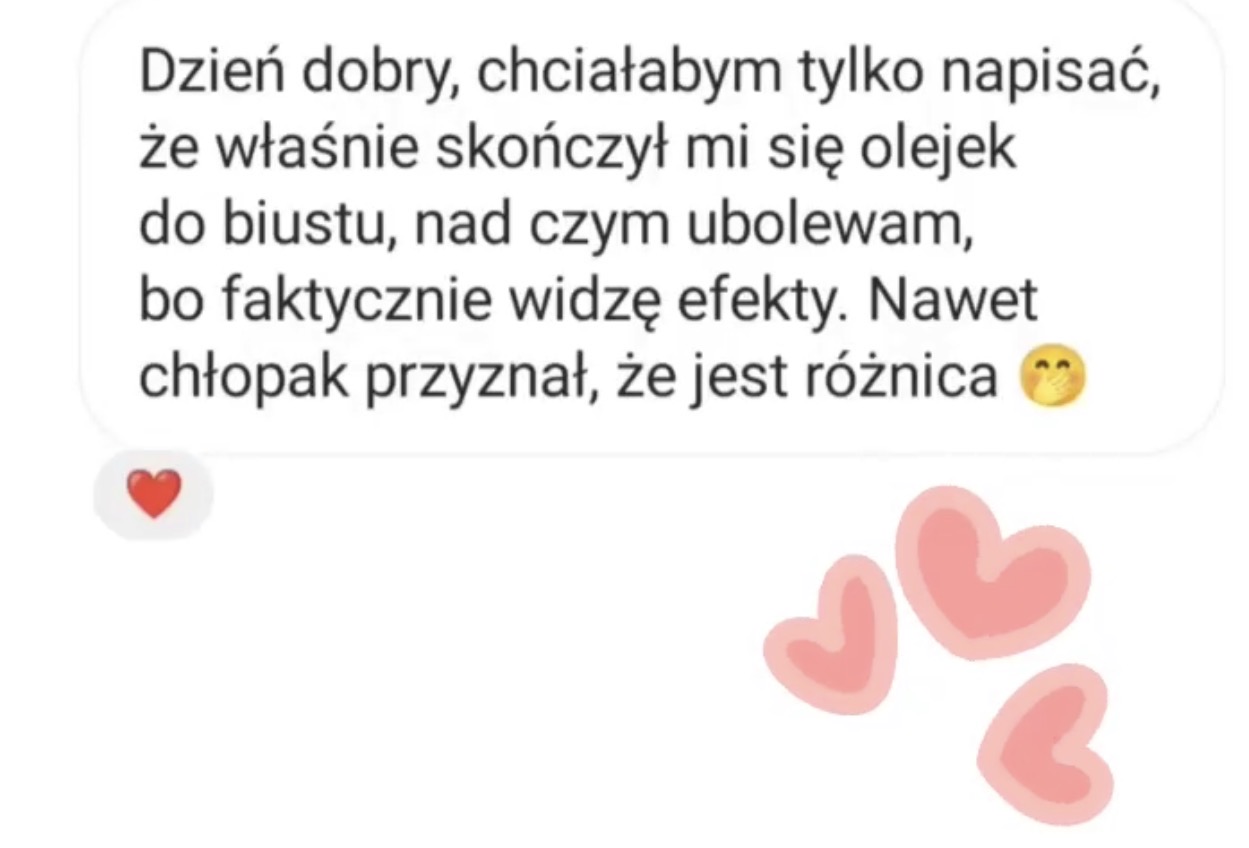 Widzę efekty po olejku, piersi stały się jędrniejsze i nawet chłopak widzi różnicę. Do tego produkt ma cudowny zapach. Na pewno zaopatrzę się w kolejne opakowania