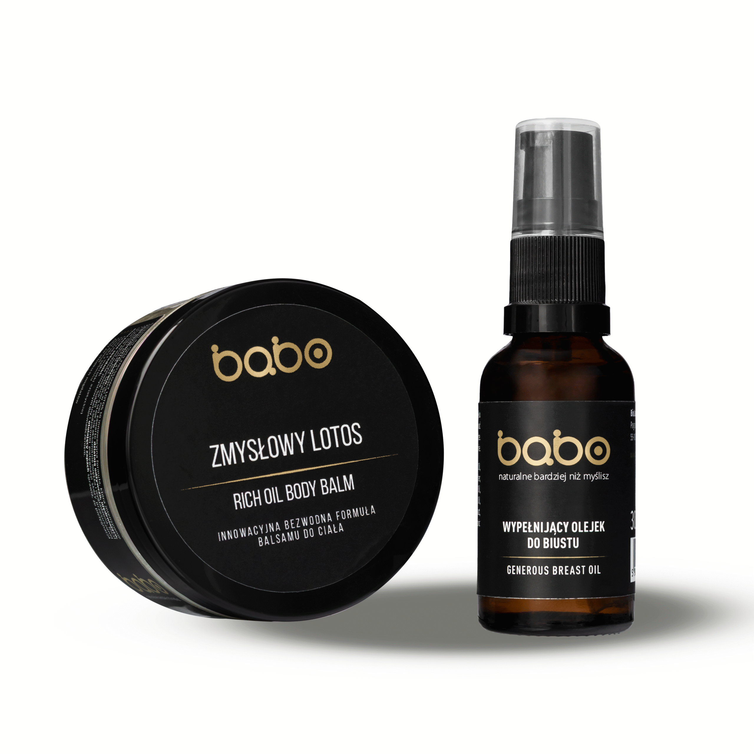 Zestaw ZMYSŁOWY LOTOS to połączenie niezwykłego balsamu do ciała o innowacyjnej formule RICH OIL BODY BALM z naszym bestsellerowym Wypełniającym Olejkiem do Biustu. Każdy z tych produktów osobno jest wspaniały, ale razem dają eksplozję przyjemności stosowania, dzięki subtelnemu i otulającemu zapachowi, a składniki aktywne zawarte w tych produktach dodatkowo zadbają o wspaniały wygląd Twojej skóry!